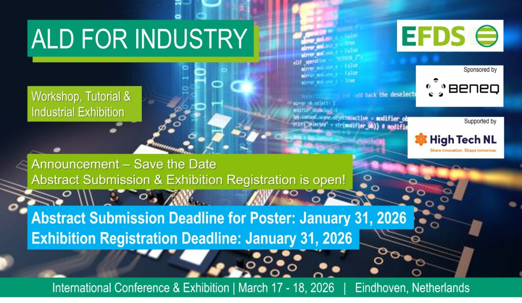 We’re happy to announce the cooperation with High Tech NL and EFDS – The European Society of Thin Films. Together, we aim to connect the thin film and microelectronics communities, promote cross-border collaboration, and drive innovation across Europe. The 9th “ALD for Industry” conference, coming up in March 17 – 18, 2026 for the first time in Eindhoven, the Netherlands.